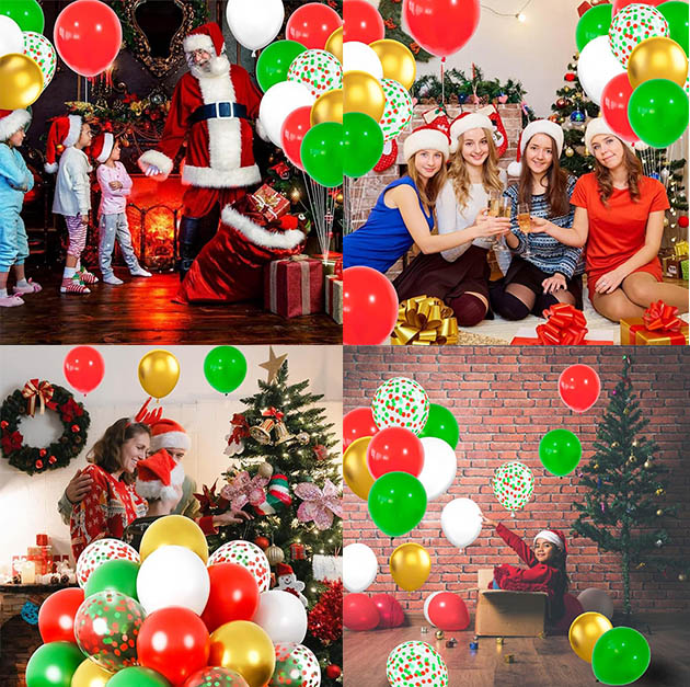 Konfetti: Az átlátszó golyót piros, zöld és arany konfetti beágyazza. Az infláció után ez olyan, mint a hópelyhek, dinamikus légkört adva a konfetti karácsonyi léggömbnek, és a statikus elrendezést "magával ragadó hóhelyre" változtatni.