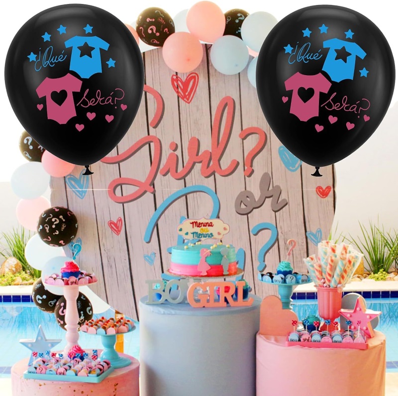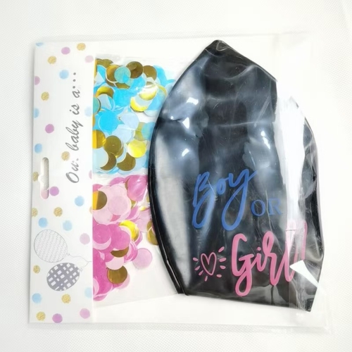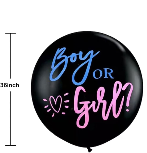 A36 hüvelykes nemet feltáró léggömbkészleten van, matt fekete színű, és sokféle nyomtatási stílussal rendelkezik, például fiú vagy lány, fiú és lány karakterkép vagy valami más, ami fiú és lányhoz kapcsolódik. A konfettihez az egyik zacskó rózsaszín papírkonfetti fóliaarany színű konfettivel, egy másik zacskó kék papírkonfetti fóliaarany színű konfettivel.