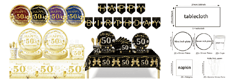 Papír születésnapi fedő: a tortadíszítés fő elemeként a fő kártya a "boldog születésnapot 50 éves korig" szavakat veszi alapul, és a fő tortadíszhez tűzijátékkal, csillagokkal, születésnapi kalappal és egyéb formákkal illik. Az alátámasztó kerek "50", jótékony felhők, korona és egyéb mini kártyák, vastagított kartonból és tömör bambuszrudakkal párosítva, cupcakes- és desszertasztalokkal díszíthetők, kifinomult részletekkel.