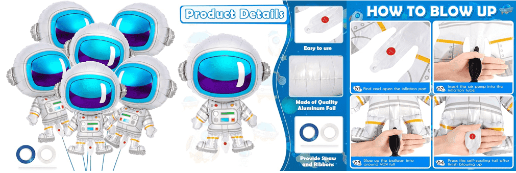 Az űrhajós fóliás ballonkészlet kicsi és igényes, kényelmes és könnyen összeállítható. Az űrhajóst a parti közepébe helyezi, a bolygó léggömb pedig körülveszi. A csillagok mindkét oldalon virágokat húznak bonyolult eszközök nélkül. A kis öltöny alkalmas kisebb családi születésnapi partik és gyerekszobák mindennapi díszítésére. Ez egy világos űrszellő órapont.