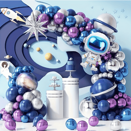 Űrhajós fóliás léggömbfüzér szett a szemet gyönyörködtető fegyver nagyszabású tevékenységekhez, alkalmas parti háttérfalra, bevásárlóközpont tevékenységek bejárati elrendezésére. A ballonlánccal az alappal, az űrhajós nyomóballon, rakétafóliás léggömb, színes bolygóballon és matt latex léggömb van közbeiktatva és rögzítve. A koszorúruha közvetlenül a falra vagy az ajtókeretre akasztható. A mély, csillagos égbolt színrendszeréhez fényes fémes csillogás társul, amely azonnal betölti a magával ragadó tér atmoszféráját, és a tevékenység helyszínének vizuális fókuszává válik.