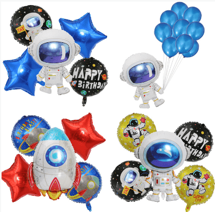 Vannak elterjedt űrhajósok teljes testalkatú, űrruhát viselő űrhajósok képét mutatják, egyes típusok talpas, felfújható állvánnyal. Különböző méretűek, például 18 hüvelyk, 24 hüvelyk, 28 hüvelyk stb., valamint néhány nagyobb léggömb, például álló űrhajós fóliás léggömbök, amelyek magassága 65 cm. Főleg tér témájú születésnapi bulikra, babaváró bulikra, gyerekszoba dekorációra és egyéb alkalmakra használják, melyek vidám térhangulatot adhatnak a rendezvénynek.