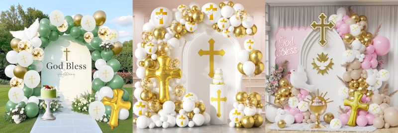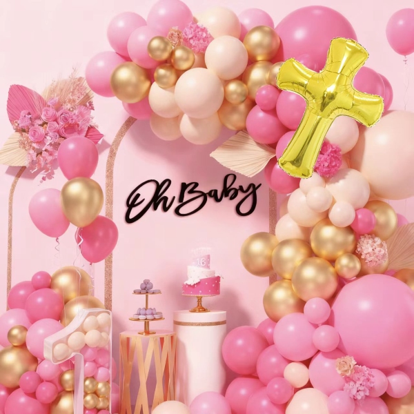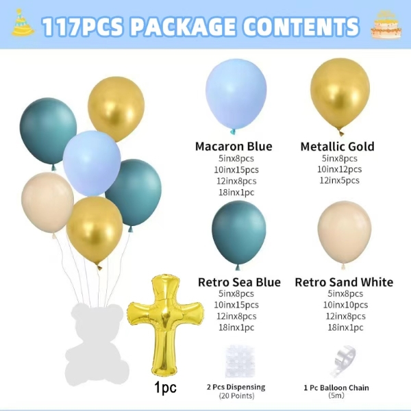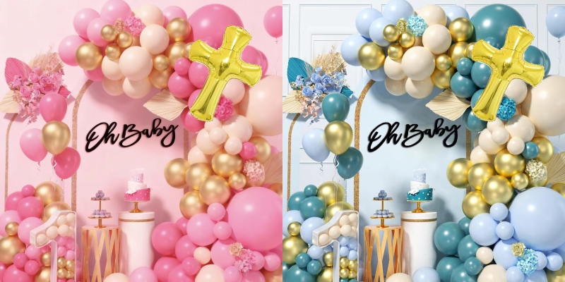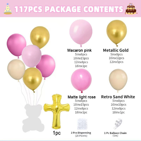 A babazuhany balloníves készleteknek kétféle stílusa van, az egyik a kislányoknak, a másik a fiúknak való. A kislány szett macaron rózsaszín színű lufiból, matt világos rózsa színű lufiból, matt világos bőrszínű lufiból, fémes arany színű lufiból és arany isten áldja keresztből áll. A kisfiú szett macaron kék színű lufiból, retro tengerkék színű lufiból, matt világos bőrszínű léggömbből, fémes arany színű lufiból és arany áldjon keresztből áll. Mindkettőn megvan a ragasztópötty és a ballon trip, ezek segítségével egész csinos füzért készíthetsz.