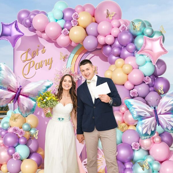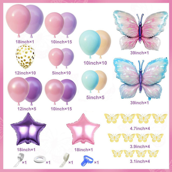 Butterfly ballon arch kit: Az íves készlet színes és szemet gyönyörködtető, különféle fóliás léggömbökből és latex léggömbökből áll. Amikor elrendezi, adjon hozzá egy háttértáblát mintákkal és különböző szövegekkel, majd vegye körül a léggömböket. A rendezvény hangulatának megteremtője. Előtte fotózni nagyon szép lesz.