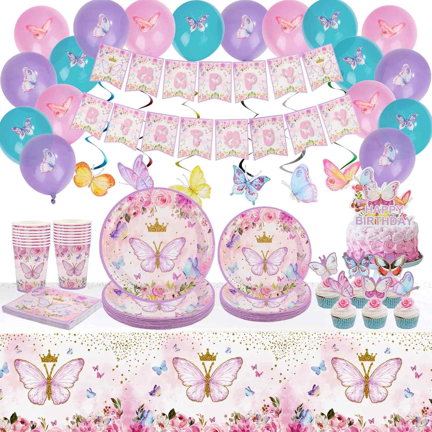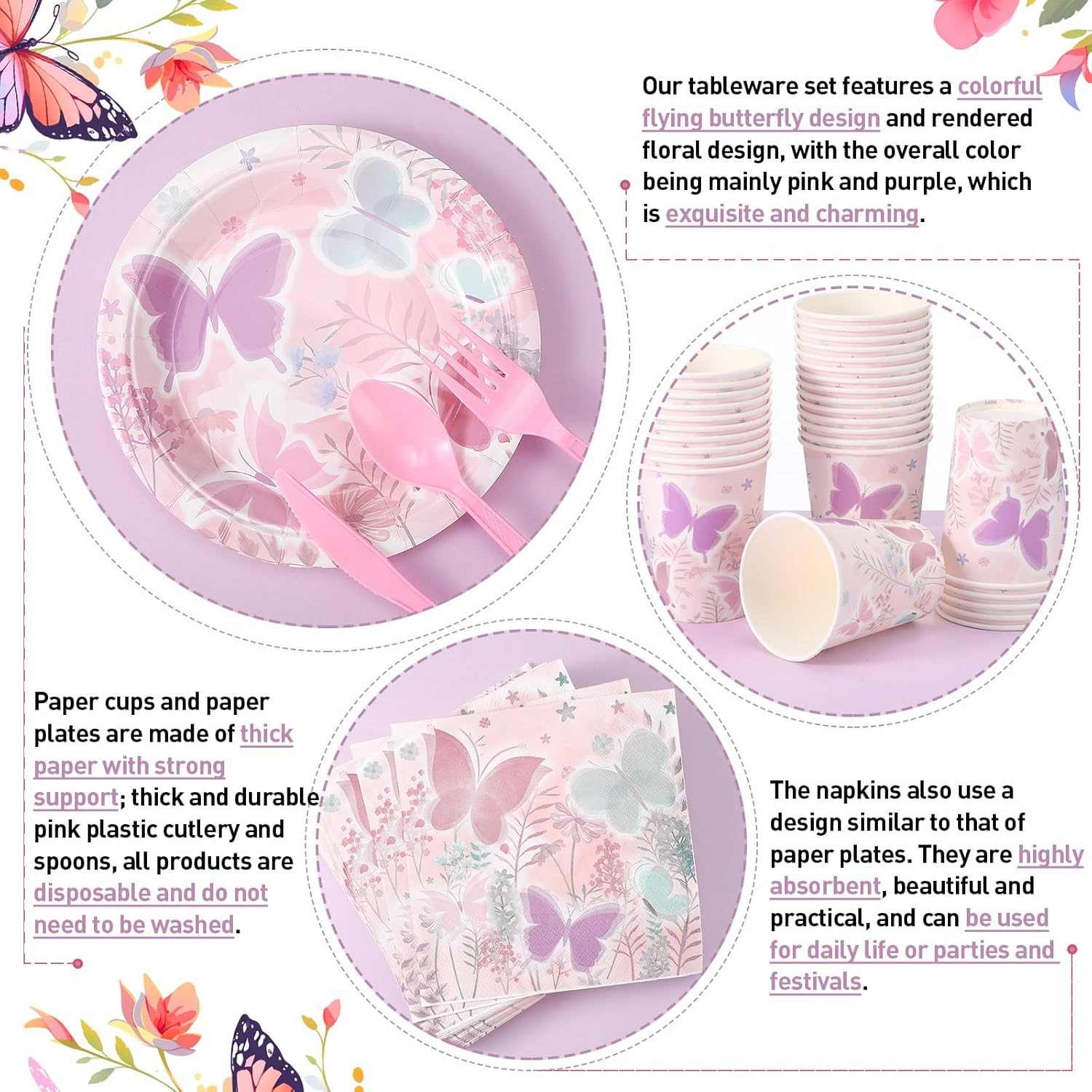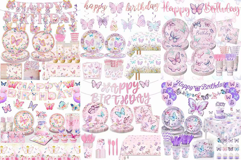 Az egyedi megoldás rugalmas. Az étkészletek száma a társaság méretétől függően változhat. A minta stílusa is változhat. Különböző témákat vagy aranyos rajzfilmes megjelenéseket mutathat. Szöveg hozzáadható, például nevek vagy párttáblák. Minden pillangós étkészlet különlegesen néz ki, és emléket őrz a buliról.