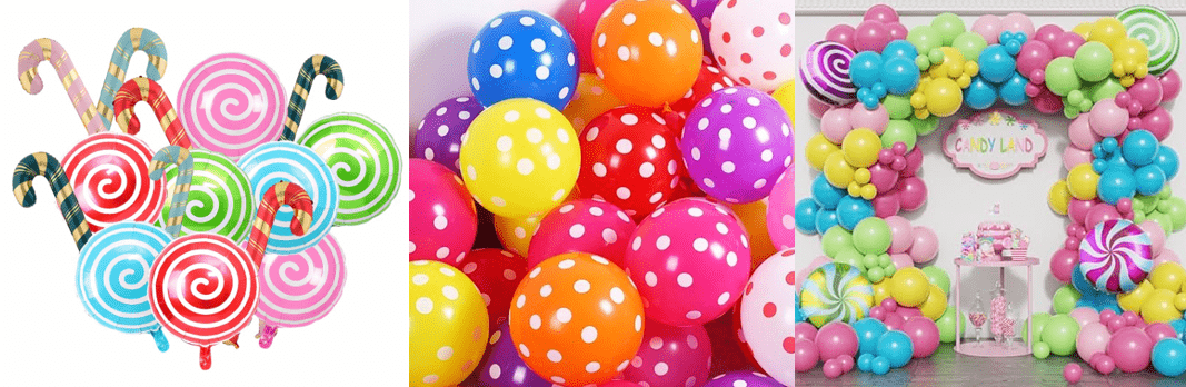 Cukorka témájú léggömbfüzér készlet édes álom cukorka színével és aranyos nyalóka formájával mint alapvető dizájnelemekkel, az általános stílus élénk és édes.