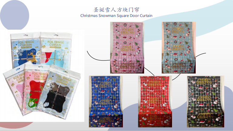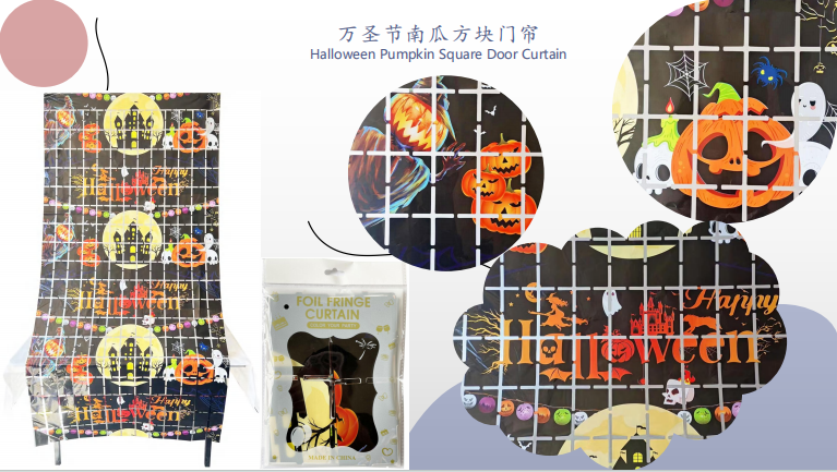 Mint például a karácsonyi témájú zöld és a vörös fóliafüggöny, a Halloween-témájú fekete és narancssárga fóliafüggöny, valamint a fóliafüggöny sütőtökkel, denevérekkel, pókokkal és más formákkal, amelyek otthoni dekorációhoz, bevásárlóközpontokban, bárokban és más helyekben használhatók.