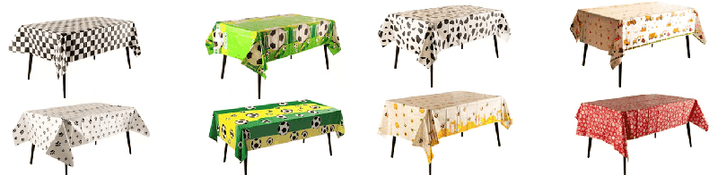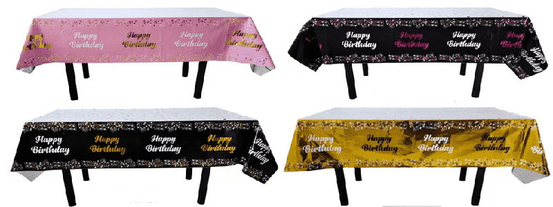 szivárvány színű, fólia terítő rajzfilm állatokkal és torta mintákkal, alkalmas gyermekek születésnapi bulikra; arany, ezüst, lézer színű csillagokkal és betűmintákkal, alkalmas felnőtt születésnapi bulikra, évfordulók ünneplésére, barátnők összejövetelére stb., elrendezhető családi étkezőasztalokba, szállodai parti asztalokba, szabadtéri piknikasztalokba és egyéb helyszínekre.