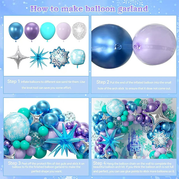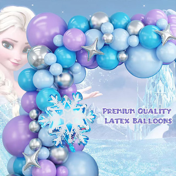 A fagyasztott parti dekorációk ballon koszorú készlet inspirálják a népszerű fagyasztott IP -t. Pontosan reprodukálja a film színeket. Egyesíti a hűvös színeket, például a kék, ezüst, lila és fehér. A kék olyan, mint Arendelle kora reggeli égboltja. A világos lila olyan, mint a varázslatos jégkristályok által refraktált fény. Az ezüst dekorációk olyanok, mint a hópelyhek tükröződése. Színes rendszert építenek gazdag rétegekkel. Álmodozó és elegáns vizuális élményt teremtenek.
