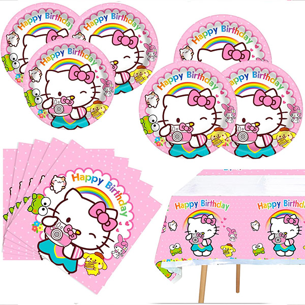 3) Asztali edények: A Hello Kitty étkészlet továbbra is párosítható a rózsaszín és fehér party kellékkészlet egyedi mintázatú mintájával, hogy aranyos hangulatot teremtsen a partihoz. Minden termék nagyon tartós, élénk színű és kiváló minőségű tapintással rendelkezik.