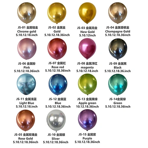 Fém léggömbök:A magasfényű tükörbevonattal, valamint a szemet gyönyörködtető textúrákkal és színekkel ezek a legsokoldalúbb latex léggömbök, amelyek parti dekorációhoz, egyedi nyomtatáshoz és sok máshoz használhatók.