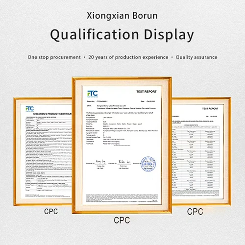 ASTM F963 (USA játékbiztonsági szabvány):Biztosítja, hogy a termék megfelel az Egyesült Államok piacának nem mérgező követelményeinek, és alkalmas gyermekek és beltéri használatra. Ez a tanúsítvány kötelező az Amazon és az Egyesült Államok piacán. Ha nagykereskedelemben vásárol léggömböket tőlünk, feljogosítjuk a tanúsítvány felhasználására.