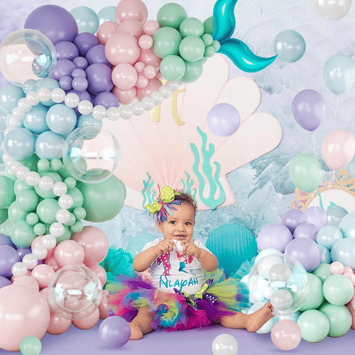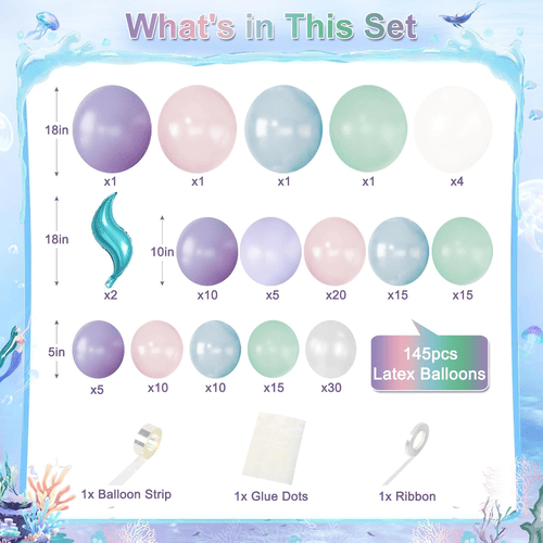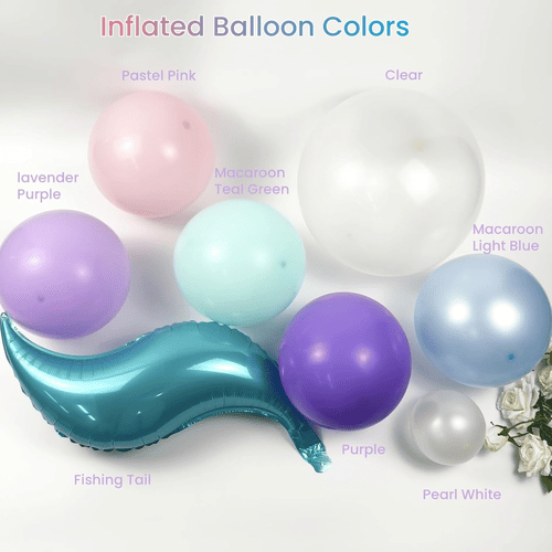 A Mermaid léggömbfüzér léggömbjei többféle színben kaphatók, például lila, levendula, pasztellrózsaszín, világoskék, kékeszöld, gyöngyfehér és átlátszó, valamint fóliás sellőfarokdísz, így remekül készíthet egy varázslatos sellő-óceán témájú partit.