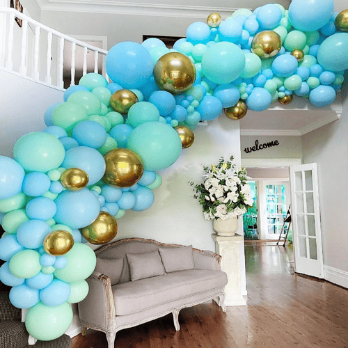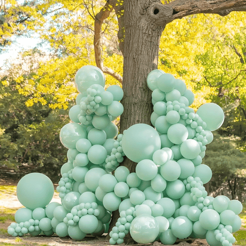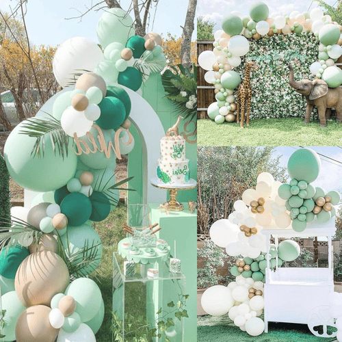 A menta léggömbfüzér rendkívül rugalmas és sokoldalú. Amellett, hogy önmagában is használható, különféle latex léggömbökkel vagy pomponokkal is kombinálható a tökéletes hatás elérése érdekében, ahogy az alábbi képen is látható.
