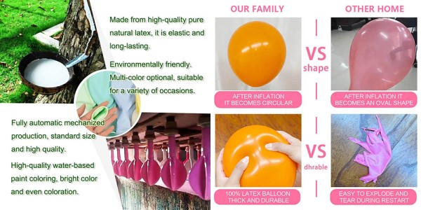 Léggömb alapanyagok: Délkelet-Ázsiából importált tiszta természetes latexből készült. A léggömbök rugalmasabbak, nagyobb méretűre fújhatók, kevésbé valószínű, hogy szétrepednek, és teljesen természetes módon lebomlanak anélkül, hogy bármilyen környezetszennyezést okoznának.