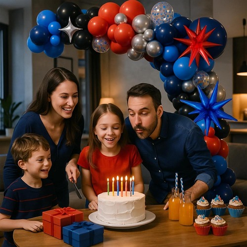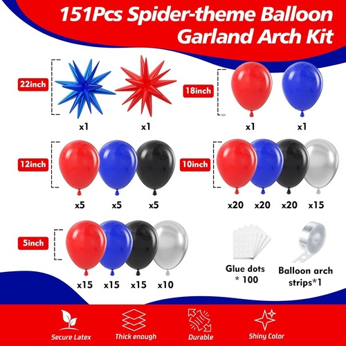 A léggömbkészlet fő színei a kék, piros és fekete. A jellegzetes három szín elgondolkodtatja Önt a filmben szereplő Pókember menő figurájával. A készlet latex léggömbjei, köztük matt piros léggömb, matt kék léggömb, matt fekete léggömb, fém szelet léggömb. A készletben található fólia lufi egy robbanócsillag fólia lufi, színe kék és piros.