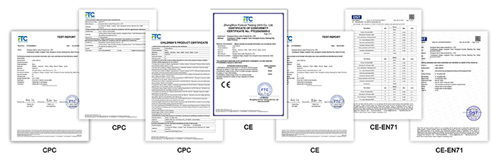 Teljes termékválasztékunk megfelelt a CPC, CE, EN71 és más hiteles tanúsítványoknak, szigorúan betartva az európai és amerikai és egyéb célpiaci biztonsági előírásokat. Ezek a minősítések segíthetnek az áruk zökkenőmentes vámkezelésében, és teljesen elkerülhetik a megfelelési kockázatokat a tengerentúli piacokon.