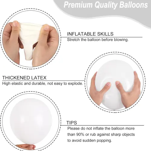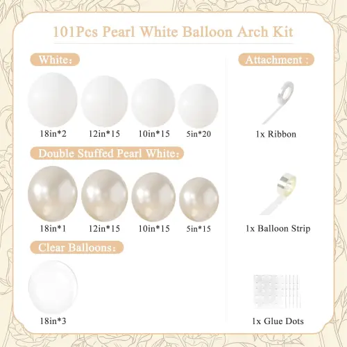 Minden fehér esküvői léggömb ívben léggömbpontok, léggömbcsíkok, szalagok, ballonnyakkendők találhatók. Mindegyik gondosan össze van hangolva, hogy gyönyörű és összetartó esküvői dekorációs hatást hozzon létre.